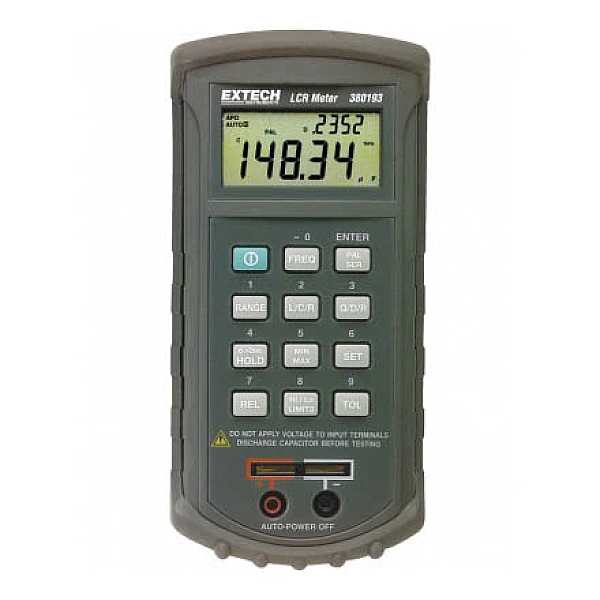 Измеритель LCR и пассивного элемента Extech 380193 измеряет индуктивность, емкость и сопротивление вместе со вторым параметром (Q, D, R). Измеряет емкость и индуктивность с точностью до 0,7%, а также сопротивление с точностью до 0,5%. Дисплей (разрядность 20.000/10.000) для одновременного вывода значений первого (L, C или R) и второго параметров (Q – качества, D - рассеяние и R - сопротивление). Частота проведения измерений: 120Гц и 1кГц.