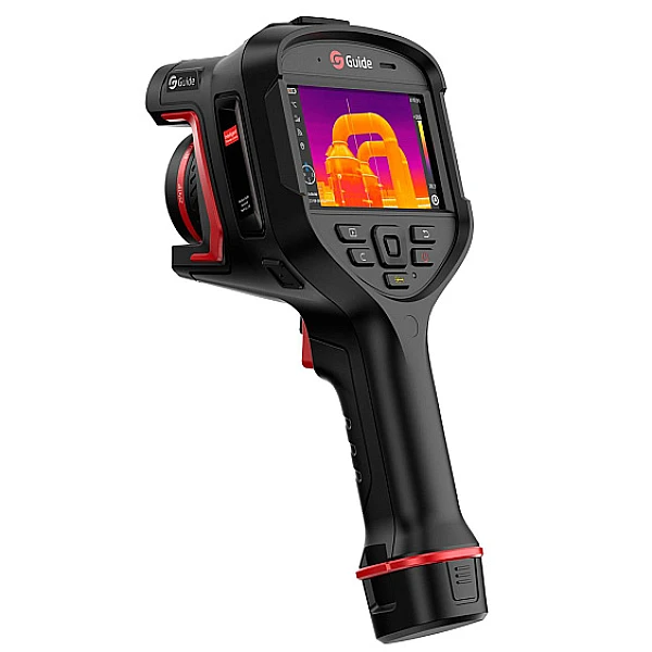 Тепловизор Guide H4 (Hammer Series) оснащён детектором с разрешением 480 x 360 пикселей и чувствительностью 45 мК, частота кадров 30Гц. Диапазон измерения температуры -40°C +150°C, 0°C +650°C с автоматическим переключением режимов работы, 5 режимов фокусировки. Тепловизор оснащён 8 мегапиксельной камерой, есть функция наложения изображений, фото с камеры видимого спектра на термограмму, в результате получается более чёткое ик-изображение за счёт прорисовки краёв объектов. В комплекте с камерой два аккумулятора, зарядки хватает на 4 часа работы.